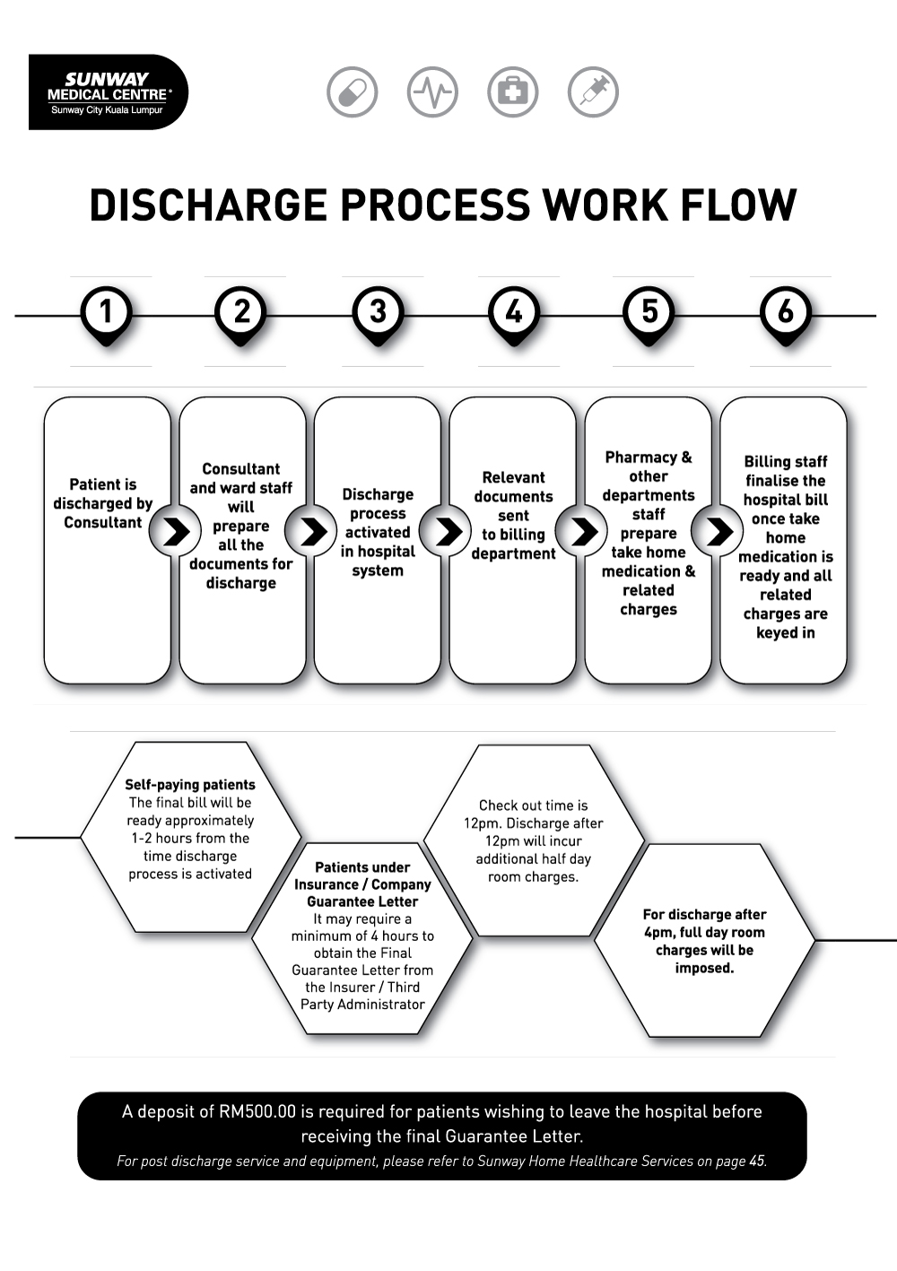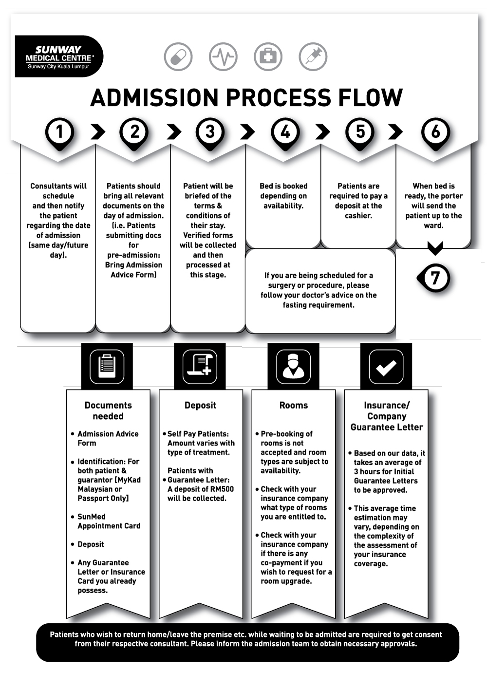 ValuablesIn the interest of safety, we request that you do not bring any valuables into the hospital. Sunway Medical Centre does not accept responsibility for loss or damage to personal properties. |