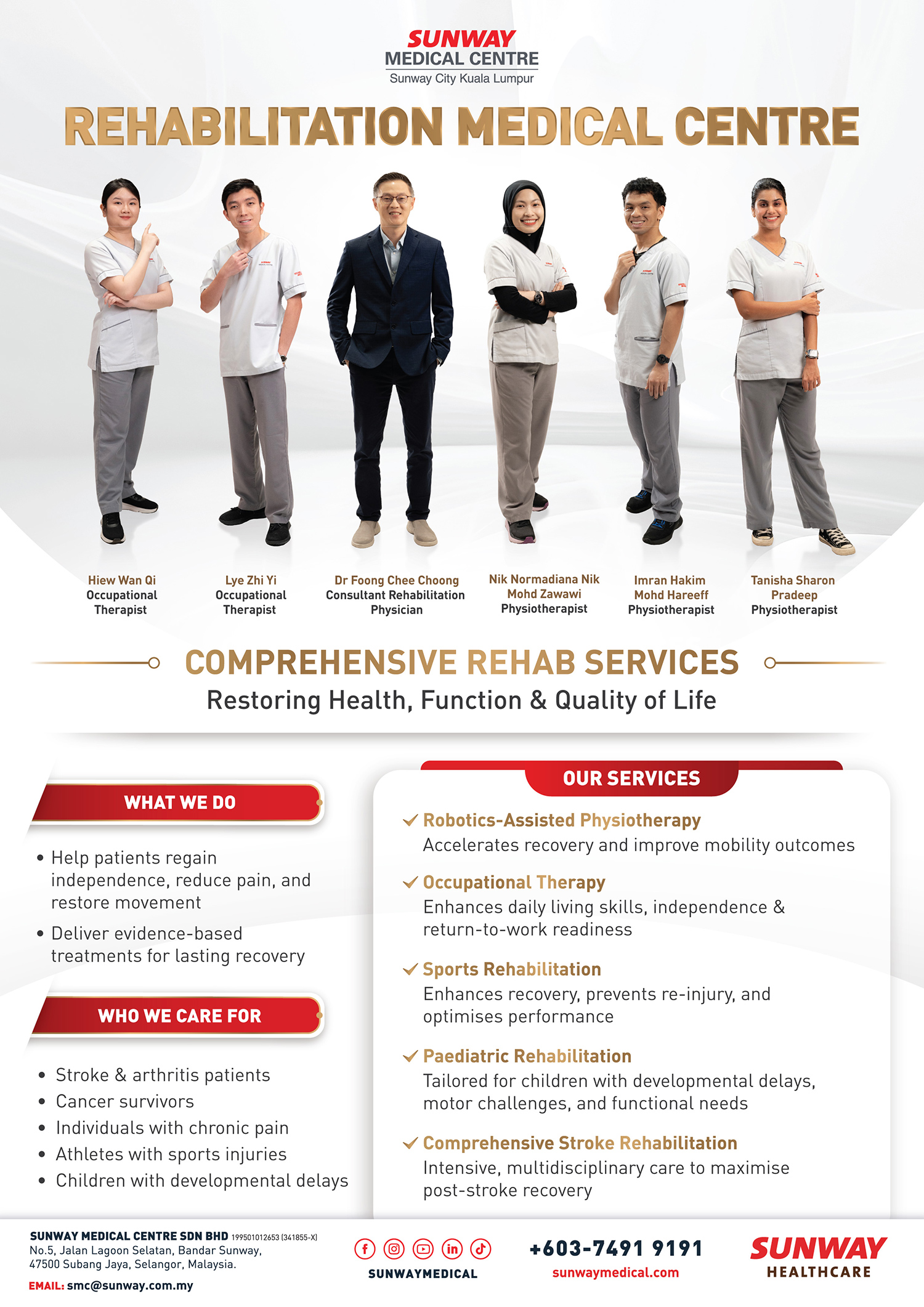 At Sunway Rehabilitation Medicine Centre, our integrated team of therapists is led by the rehabilitation physician to help restore function in patients suffering from stroke, arthritis, cancer, diabetes, hip replacement, chronic pain, sports injury, developmental delays, and many other physically debilitating conditions.